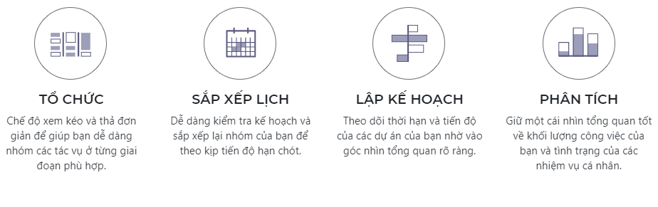 • Hiển thị danh sách công việc trực quan, phong phú: kéo & thả các nhiệm vụ dễ dàng với chế độ xem kanban, danh sách, …