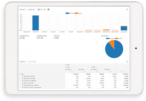 Hiển thị tất cả các chi phí liên quan đến một phương tiện hoặc một loại dịch vụ và so sánh các loại chi phí (phương tiện nào chi phí nhiều nhất; dịch vụ nào đã được thực hiện trên phương tiện nào, v.v.) bằng cách sử dụng công cụ báo cáo.