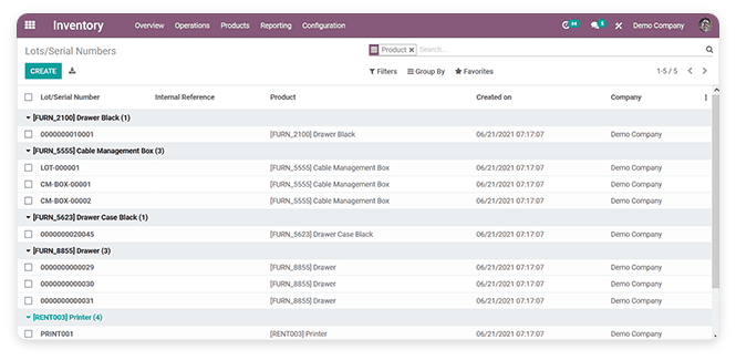 Với tùy chọn xác định số sê-ri cũng như số lô cho các sản phẩm, bạn sẽ có khả năng truy vết nguồn gốc hoàn chỉnh về việc di chuyển sản phẩm giúp cho hoạt động kiểm kê của công ty.