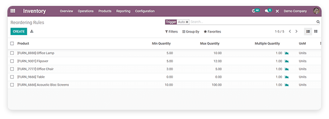 Có thể cấu hình để tạo đơn đặt hàng tự động theo quy tắc sắp xếp lại và ngăn không cho tạo đơn đặt hàng bằng cách đặt phạm vi sẵn sàng.